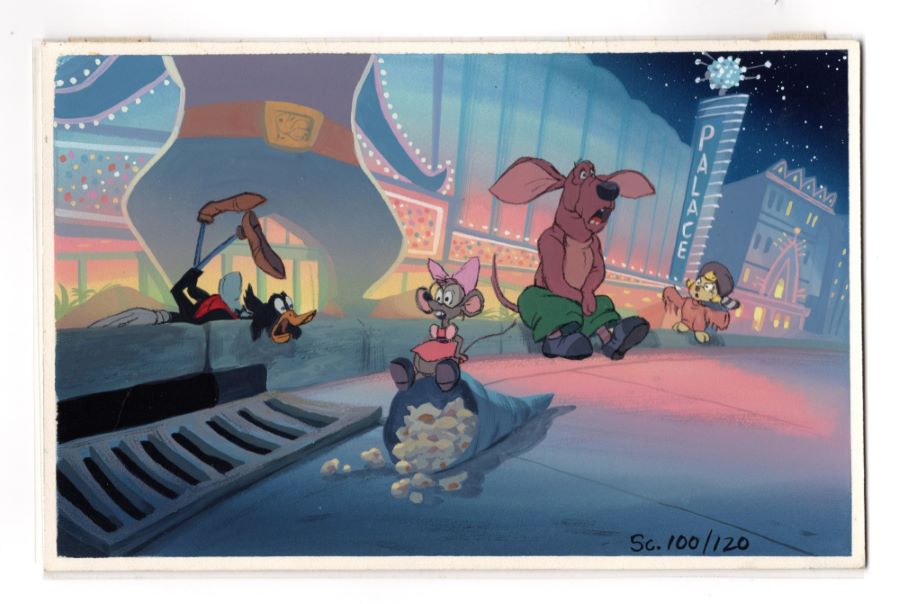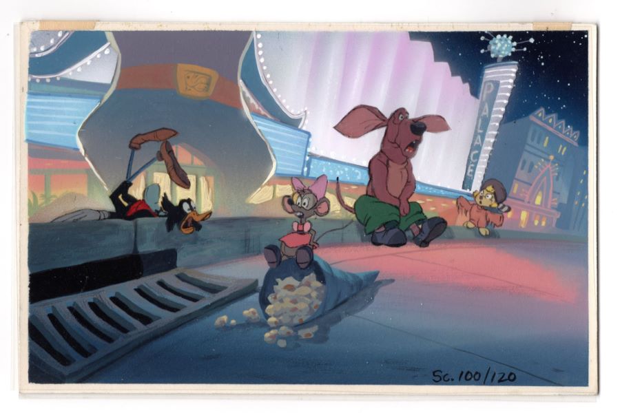A background color concept that was used during the development of the Don Bluth Productions film Rock-A-Doodle (1992). Featuring Edmond, Snipes, Peepers, and Patou on the street in front of Pinky’s Palace where Chanticleer is performing, the painted concept was created at the studio and used in the early development of the film. Don Bluth Productions uniquely used these concepts not only to develop the scene's color palette, style, and emotion, but also as storyboards to visualize the full story development. Measuring 5"x8" overall and with the image area measuring 4.75"x7.75", the background color key concept is in very fine condition.