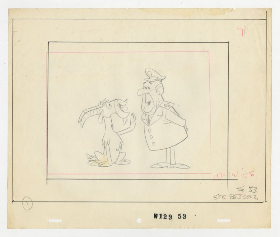 A layout drawing from the Hanna Barbera Studios animated series “Magilla Gorilla” (c.1960s). Featuring a goat and a uniformed captain, the graphite drawing was created at the studio and used during the animation process. Measuring 10.5"x12.5" overall, with the character image measuring 4.75"5.5", the drawing is in very good condition with minor edge wear with a few small tears along the top edge area.