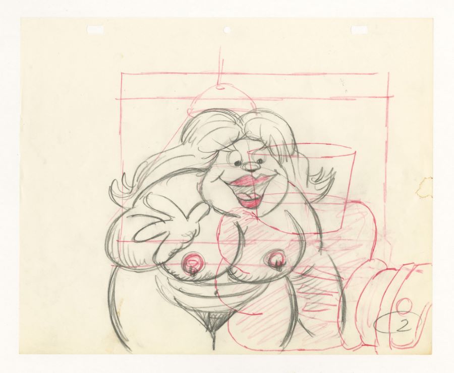 A layout drawing from an unknown Ralph Bakshi Studios animated film (c.1970/80s). Featuring a rough sketch of a provocative woman receiving a glass from a gloved hand, the graphite on paper drawing was created at the studio and used during the animation process. Measuring 10.5"x12.5" overall with the character image measuring 7"x7.5", the layout drawing is in very good condition with light edge wear and a small stain on the right edge.